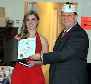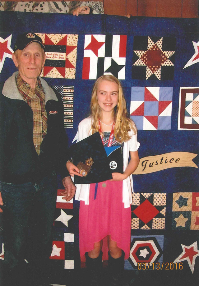 His granddaughter Dani Sonnen helped present Vern Sonnen with a Quilt of Valor at the VFW awards banquet. Photo by Shirley Baerlocher.