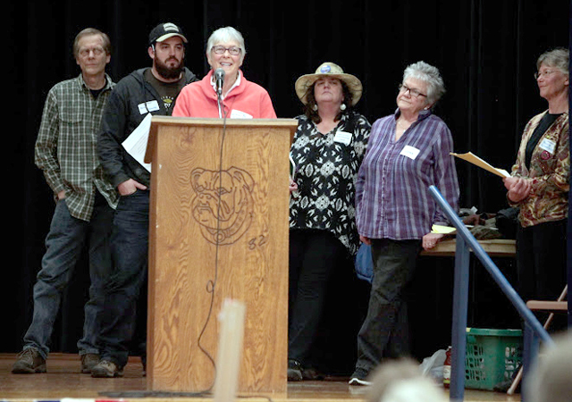 Speakers for Bernie Sanders: Larry Nims of Kamiah, left, Jared Reynolds of Grangeville, Linda Hagedorn of Little Salmon River (Pollock) center, Mary Ann High of Grangeville, Liz Clark of Clearwater and Bonnie Schonefeld of Big Cedar, right, at the Idaho County Democratic Caucus in the Grangeville High School cafeteria in Grangeville, Idaho. Photo by Laura Embry/LifePhotos.net