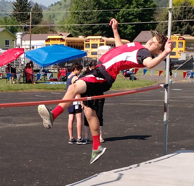 Derik Shears in the high jump at the Jr. High meet at Kamiah. He went on to clear 5’4” to break the Jr. High record. Photo provided by Glenn Poxleitner.
