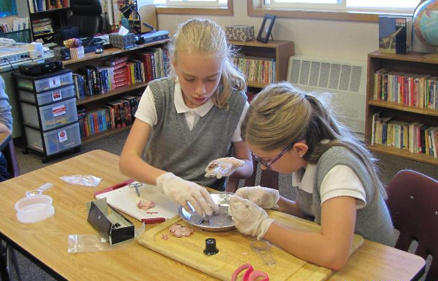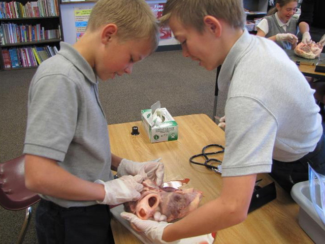 Cody Wassmuth and Torry Chmelik check out the valves of the cow's heart. Photo by Summit Academy |