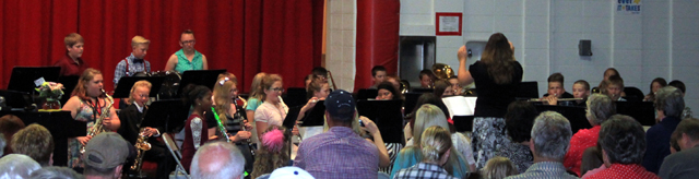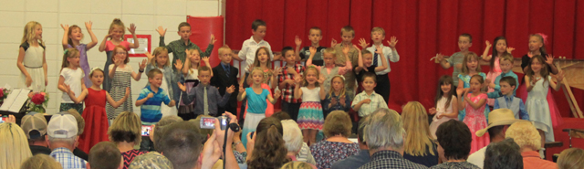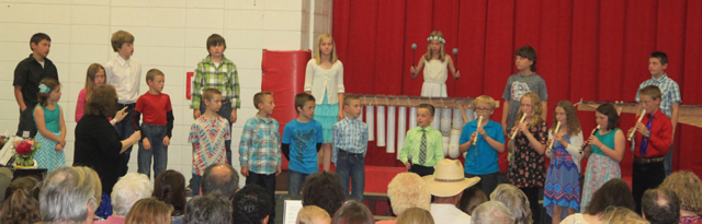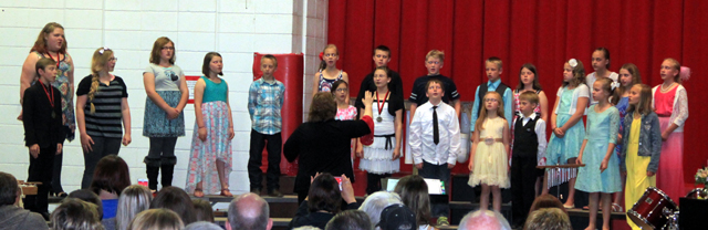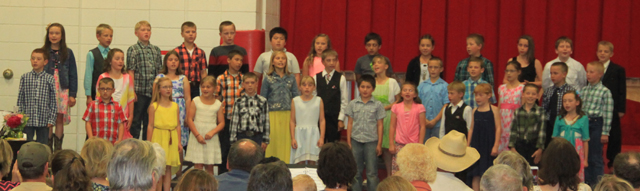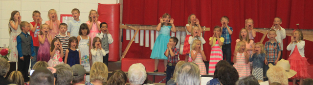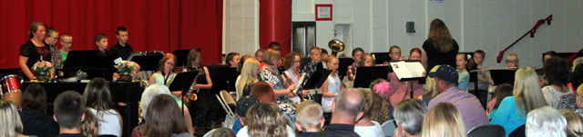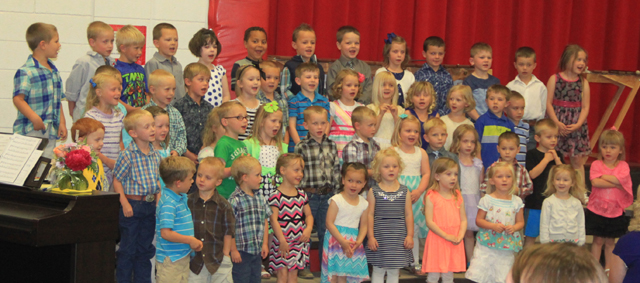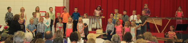 From top down are the Preschoolers, Kindergartners, 1st graders, 2nd graders, 3rd graders, 4th graders, Prairie Youth Choir, 5th grade band and 6th grade band at the Elementary Concerts held last Wednesday, May 18. Preschool through 4th grade were in the aftnoon while the Youth Choir and 5th and 6th grades were in the evening. |