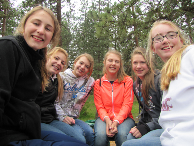 Pictured are 7th and 8th grade girls Erin Chmelik, Lexi Currier, Hailey Stubbers, Kelly Stubbers, Claira Osborne and Jessie Sonnen are all smiles before the hiking begins. Photo by Summit Academy. |