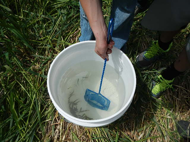 Steelhead fingerlings in the bottom of a bucket ready to be released.