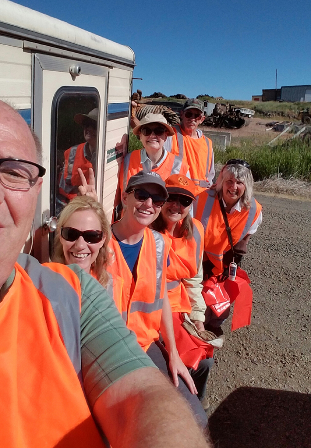 Front row, Bill Farmer of Cottonwood, Michele Waite, Stephanie Berry, Michelle Perdue, Shelley Dumas and back row Jennifer Artley and Mike Perdue, all of Grangeville, preparing to clean Highway 95.