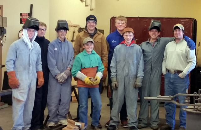Shop class and FFA members at Prairie High School built the framework for the crops signs seen in fields along Highway 95. From left to right: Thomas Schwartz, Ryan Arnzen, James Villamor, Kace Munger, Carson Schmidt, Spencer Schumacher, Conrad Duman, and Mr. Don Curry. Photo provided by Julie Fowler.