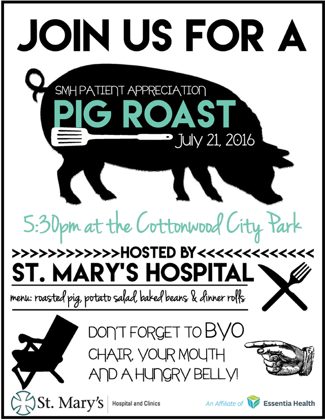 “At St. Mary’s Hospital and Clinics our patients come first and foremost and we are so thankful for the opportunity to care for them,” says Matthew Forge, CAO, SMH. “This barbecue will hopefully bring our communities together and allow us to say thank you for that opportunity.” SMH will host a Patient Appreciation pig roast on Thursday, July 21st at 5:30PM at the Cottonwood City Park. The menu will include roasted pig, potato salad, baked beans and dinner rolls. “Go ahead and bring a chair, a hungry belly, and maybe some stories to share,” says Forge. “We are always striving to provide quality care close to home and we are so grateful to all of our patients, in all of the wonderful communities we serve. So, Kamiah, Nezperce, Craigmont, Cottonwood and beyond, come out on the 21st and enjoy some good food and great company!” says Forge. ![]() |
