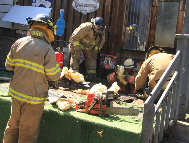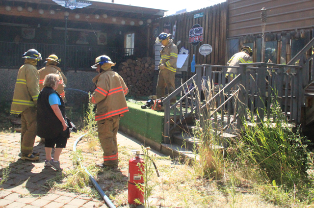 A fire broke out in the enclosed outdoor portion of the former Royale Room right next to the Hers and Sirs Building last Tuesday, August 2 at about 3 in the afternoon. Doris Stubbers, owner of Hers & Sirs Beauty Salon said she could smell smoke and thought her heating system was acting up, saw nothing there and then went outside and saw the smoke and flames. Stubbers put in the 911 call to get the Fire Department called in and they responded and got the fire doused. They then checked for hot spots with a thermal imager from both inside and outside of Hers and Sirs and got those taken care of as well. Fire Chief Roy Uhlenkott said there’s no readily apparent cause of the fire as it appears to have started at the back of the old Buggy Whip stage which sets up against Hers & Sirs. The area was locked up and the fire department had to break in to get to the fire. There was nothing there that could have been a fire starter according to Uhlenkott. Uhlenkott’s suspicion is that somebody got in there, was smoking, and flipped their cigarette butt, which wasn’t completely out. Some of the 2x4 studs in Hers & Sirs building got charred and there was some insulation and tin damage done to get at the fire Uhlenkott commended the Department for their swift response and the numbers that responded. Of course when the call goes out for a “fire on Main Street in Cottonwood” you start thinking the worst.