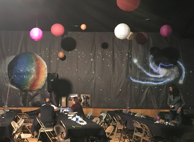 Summit Academy held their 19th annual Mystery Night Fundraiser on Saturday, October 8th. The Greencreek Community Hall truly looked ‘Out of This World’. The entryway was transformed into ‘heaven’, with lights and billowing clouds all around as well as an image of a welcoming Jesus. A pile of moon rock guided guests into the main hall where the décor turned more galactic. The entire hall was blacked out and had stars lighting many walls as well as giant planets, nebulas and a crescent moon. Eerily colored lights with more moon rock graced the tables as centerpieces. Shirley Stubbers and Therese Schmidt headed up the decorations, along with a crew involving many Summit parents. The event, chaired by John and Patti Watson, began with time for socializing and enjoying food prepared by volunteers led by Kim Stubbers and Linda Beckman. Specialty drinks including a ‘Milky Way’ and ‘Big Dipper’ were available in light-up cups which gave guests a chance to join in the cosmic look. Attendees also browsed and bid on a variety of silent auction items donated by many generous businesses and individuals. Rick Musick once again led the live auction, which included alumni antics to show off each item. Several hosted dinners including a Murder Mystery Dinner were in high demand. Also auctioned off were several trips including a week of skiing and an overnight stay at Mackay Bar Ranch. The elimination raffle was the evening’s main event as one by one the 350 tickets were drawn. Each 10th ticket drawn won that guest a trip on stage to choose a $100 prize. Stage MC’s were the silver-clad Kevin Rehder and Norm Sonnen who, along with their wives Kathy and Julie, dressed in glowing celestial gowns, helped winners choose their prize. Prizes and auction items were procured by a committee headed by Alea Wassmuth. Finally, the last 10 Mystery Night ticket holders were called out and enthusiastically welcomed onto the stage by the Summit Academy alumni. The elimination process continued as the final 10 names were drawn out one at a time. Each of those ticket holders was given a consolation prize as the alumni performed skits to add to the anticipation and fun. Barbara Flerchinger, grandparent of Summit students, was the last name left in the tumbler and the winner of $10,000 in gift certificates to be used at the Mystery Night sponsors: Lindsley’s Furniture and Appliance, Sonnen Meats, Les Schwab Tire Center–Grangeville, B & A Performance Auto, Intermountain Feed & Mercantile, Hoene Hardware, Chesky Woodworking, and Cottonwood Foods. Thank you to all who supported our largest fundraiser of the year through attending or donating.