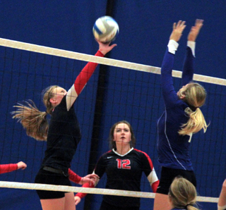 Leah Higgins looks to poke the ball away from the blocker in the Genesee match. Also shown is Angela Wemhoff. 27-at Lewiston Tournament, won 1 match, lost 4. 27-JV at Genesee JV Tournament 30-Genesee*, there, C, JV, V, 5 p.m., lost 1 game to 3 7-JV at Sacajawea 9th, 5 p.m. postponed 8-Lapwai*, here, won 3 games to 1 10-JV and C teams at Grangeville JV Tournament 13-CV*, here, 4:30 p.m., won 3 games to 0 13-Orofino, here, 7 p.m., V only, lost 1 game to 3 15-Grangeville, there, C, JV, V, 5 p.m., lost 2 games to 3 20-Kamiah, there, C, JV, V, 5 p.m., won 3 games to 1 22-Genesee*, here, C, JV, V, 5 p.m., lost 1 game to 3 24-Border Battle at Pomeroy, won 4 of 5 matches 27-Lapwai*, there, won 3 games to 1 29-Troy*, here, C, JV, V, 5 p.m., lost 0 games to 3 8-Tri-Match vs. Potlatch* & CV* @ C.V., 1 p.m. V only, beat CV 3 games to 0; beat Potlatch 3 games to 1 10-JV at Sacajawea 9th, 5 p.m., rescheduled from Sept. 7 11-Grangeville, here, C, JV, V, 5 p.m., lost 2 games to 3, details next week 13-Potlatch*, there, C, JV, V, 4:30 p.m. 15, 17, 18,19-District at LCSC-beat Kamiah 3 games to 0, lost to Genesee 1 game to 3, beat Potlatch 3 games to 0, beat Lapwai 3 games to 1 (details next week) , Third Place 20-Play-in vs. Wallace at Coeur d'Alene High School 5 p.m. 22-Play-in at Highland vs. District 3 4th place team 28-29-State at Rigby *League Game |