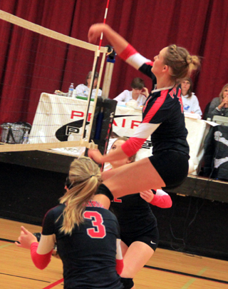 That gave Prairie a tough road to make it back to the state tournament as they would have to win 4 matches in 6 days in 3 different cities. In the opening game Prairie fell behind early but took the lead a couple times only to fall behind again. They trailed 12-13 when McWilliams scored a kill to send Wemhoff to the service line. An ace and a kill each by McWilliams and Bruner put Prairie ahead 16-13. After a sideout, 2 more kills by McWilliams made it 18-14. After another sideout, a kill each by McWilliams and Higgins made it 20-15. Genesee scored the final 5 points only on sideouts as Prairie was able to sideout the Bulldog servers. In the second game Prairie had an 11-6 lead after 3 straight aces by Uptmor but then the game turned. Genesee came back to take a 12-13 lead and after tying the score at 14, Prairie trailed the rest of the game. In the third game Prairie led only 1 time, at 1-0 on a kill by Bruner. They tied it at 5-5 but the gave up 3 straight points and never led again. In the fourth game a stuff block by McWilliams and a kill each by McWilliams and Bruner gave prairie a 3-0 lead. Genesee came back for leads of 6-7 and 7-8 but a 4-point run by Higgins gave Prairie a 12-8 lead. She had an ace while McWilliams had a kill and a block and Bruner added a kill. Genesee fought back and finally took the lead back at 21-23. Prairie tied it at 23 with a kill by Wemhoff and an ace by Bruner but Genesee’s Courtney Burt scored a kill to get to match point. Genesee bricked the serve but Prairie couldn’t capitalize as they were called for a net foul to set up another match point for Genesee. Burt scored another kill to send the Bulldogs to the championship match and the state tournament while Prairie had to fight their way to state the hard way as Genesee had to do the past two years. Prairie and Genesee look to be well matched but it seemed every time Prairie would get some momentum going they would brick a serve or some other unforced error. McWilliams had 15 kills, including 4 blocks, plus 4 assists and 2 aces. Leah Higgins had 12 kills, 1 assist and 2 aces. Uptmor had 11 kills, 3 assists and 4 aces. Wemhoff had 9 kills, 21 assists and 2 aces. Bruner had 9 kills, 2 assists and 2 aces. Pecarovich had 6 kills and 4 assists. Krogh had 1 kill, 16 assists and 1 ace. They