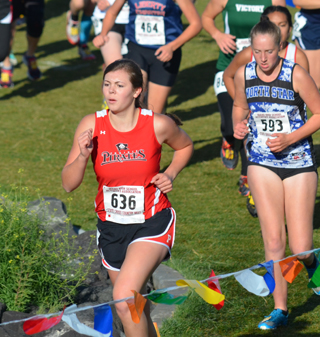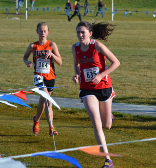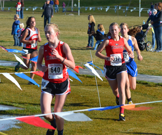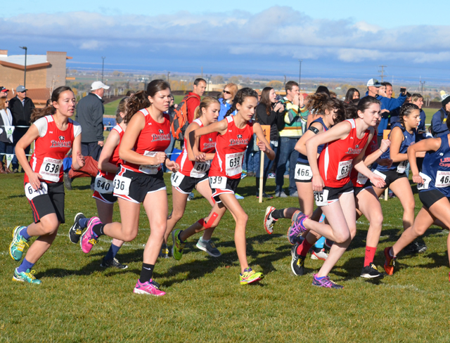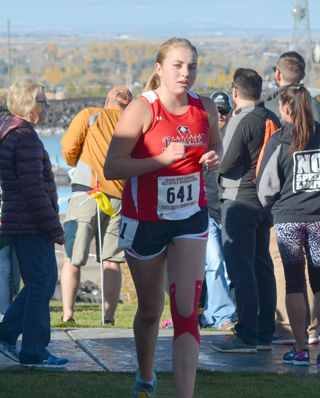 And they’re off as the girls 1A race gets started. From left for Prairie are Calli Perrin, Jessie Sonnen, Kendra Duclos, Kodie Tidwell, Jacey Rambo and Ciara Chaffee. Those are Hope McIntire’s red socks behind Chaffee..