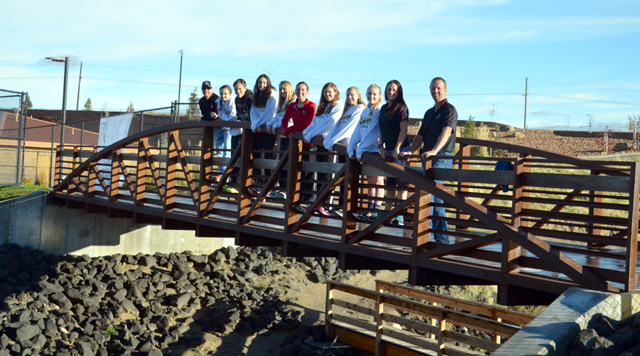 The crosscountry team and coaches on a picturesque bridge at the Portneuf Wellness Center, site of the state meet.