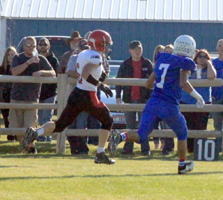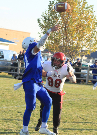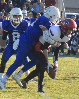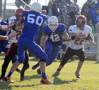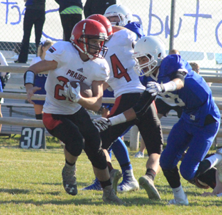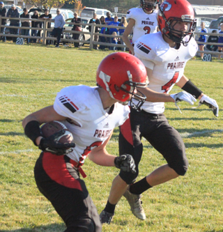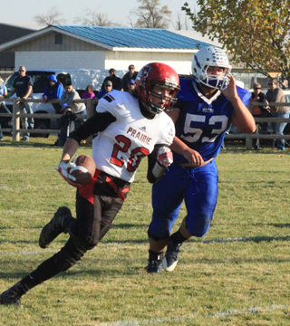 The big loss to injury was starting quarterback/defensive end Spencer Schumacher, who injured his knee earlier in the week during practice. Illness took out a couple more players and before the game was over Brandon Anderson was hurt and wouldn’t have been able to play next week if the Pirates had won. Defense dominated the early going as neither team moved the ball on their first two possessions. For their third possession Notus took over at the 50 after a Prairie fumble and needed just 1 play to score as Chase Slate got open behind the defense and went 50 yards with a pass from Caleb Zimmerman. Prairie was able to answer right back through on their third possession. Carson Schmidt covered an onside kick at the Prairie 47. Luke Wemhoff picked up 11 yards to the right. Anderson went up the middle for 5 and Wemhoff for 6. From the 31, Wemhoff took a pitch from quarterback Devin Ross around left end and went 31 yards for the touchdown. Anderson moved to quarterback for the 2-pointer and took the ball in for the tying 2-pointer. Notus took back the lead early in the second quarter when Zimmerman connected with Mark Green for 37 yards. The 2-point try failed with Notus leading 8-14. Prairie took over at their own 37 and Wemhoff needed just 1 play to go 63 yards for the tying touchdown. He broke a tackle about 8 yards downfield and then outran the defense the rest of the way. Wemhoff then ran in the 2-pointer to give Prairie their first lead of the game at 16-14. Notus threatened to take the lead back as they moved down to the 2 yard line but Jake Stubbers intercepted a pass in the end zone to end that threat. Prairie was able to move the ball out to midfield but then had to punt. Notus came right back down the field, completing 5 of 6 pass attempts, with Slate catching the fifth for 32 yards and the touchdown. Zimmerman ran in the 2-poitner for a 16-22 Notus lead. Notus then recovered the onside kick but Stubbers picked off another pass as the half ran out. Prairie received the second half kickoff and moved into Notus territory where a fumble ended the threat. Prairie got the ball right back though as Michael Schwartz intercepted a Zimmerman pass. Prairie was forced to punt as was Notus. Prairie took over at their own 40 and ran 10 straight running plays. They had Anderson at quarterback in the wildcat formation and he wound up scoring the tying touchdown from 8 yards out. The 2-point try failed leaving the score tied at 22-22. Prairie forced Notus to punt again and took over at the Notus 45 after a 35 yard return by Anderson. Prairie then pulled out the hook and lateral play as Anderson passes to Hunter Chaffee who just got the lateral off before being tackled to Wemhoff who took the ball 45 yards to the end zone. Wemhoff ran in the 2-pinter for a 30-22 Prairie lead with 11:38 left to play. Notus ran their own hook and lateral for a 37 yard gain to help set up the tying score. They wound up scoring on a halfback option pass from Brandon Patrick to Jacob Godina