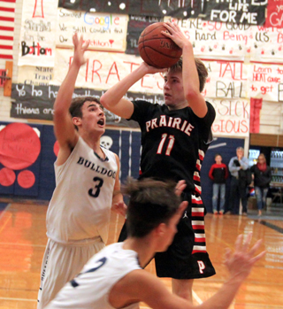 Prairie took their first lead before the game even started as one of their players was left out of the scorebook leading to a technical foul. Chaffee sank both free throws for a 2-0 Prairie lead. Chaffee then got fouled after the ensuing inbounds pass and added another free throw. Anderson scored on an inbounds pass from Branson and Chmelik added a tip-in for a 7-0 Prairie lead. Grangeville came back to trim the lead to 1 At 7-6 and again at 9-8 but Prairie then finished the quarter with a 7-0 run with Branson scoring 5 of those points and assisting on the other, an inbounds feed to Chmelik as Prairie took a 16-8 lead. A putback by Wemhoff opened the second quarter scoring and put Prairie up 18-8. Grangeville got back within 5 at 18-13 but Chmelik then scored 6 of the next 8 points on a jump hook and a pair of tip-ins as Prairie pushed the lead to 11 at 26-15. Prairie led 30-22 at the half. Chmelik scored the first 3 points of the second half on a lay-up and a free throw but then Grangeville got a run together. The Bulldogs outscored Prairie 2-11 to cut the lead to just 2 points after a 3-pointer by Trey Dreadfulwater with 2:18 left in the third. Prairie’s defense came back to life and they shut out Grangeville the final 2 minutes of the quarter. Meanwhile Anderson sank a 3-pointer to make it 38-33 after 3 quarters. It was still a 5 point game at 40-35 with 7:15 left. Prairie then took over the game as they held Grangeville scoreless for over 5 minutes and allowed just 4 points in the final 7 minutes of the game. During Grangeville’s scoreless streak Branson scored a basket, Chmelik hit 2 free throws and Anderson scored inside to make it 46-35. After Grangeville broke their drought, Anderson scored on a putback and then added a 3-point play when he broke free for a long pass from Schlader for a lay-up and got fouled. That made it 51-37 with 1:20 to play. Grangeville scored their final basket with 1:06 left and Anderson and Wemhoff each added a free throw for the final margin. Anderson also wound up in double figures with 13 points while Branson scored 9, Chaffee 6 and Schlader, Wemhoff and Mager scored 2 each. Prairie dominated the boards 48-27 thanks to Chmelik and Schlader who had 11 rebounds. Anderson had 4 steals and Schlader 3 while Branson had 3 assists. Prairie was 21 for 44 from the field, 48%, and 10 for 24 at the line, 42%. Grangeville was 15 for 44 from the field, 34%, and 7 for 15 at the line, 47%. Prairie is now 2-0 on the season. Prairie 16 14 8 15 -53 Grangeville 8 14 11 6 -39 Prairie-Schlader 1-9, 0-2, 2; Chmelik 8-14, 3-7, 19; Chaffee 1-7, 4-6, 6; Branson 4-7, 1-2, 9; Anderson 5-8, 2-5, 13; Wemhoff 1-5, 0-2, 2; Mager 1-2, 0-0, 2; Ott 0-1, 0-0, 0. 3-pointers-Anderson. Grangeville-Dreadfulwater 4-12, 2-2, 11; Stokes 3-12, 4-9, 11; Kennedy 2-3, 0-0, 4; Schumacher 4-7, 1-2, 9; Ruklic 1-4, 1-2, 3; Bonn 0-0, 0-0, 0; Hunter 0-1, 0-0, 0; Bush 1-2, 0-0, 2; Vanderwall 0-3, 0-0, 0. 3-pointers-Dreadfulwater, Stokes.