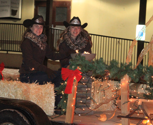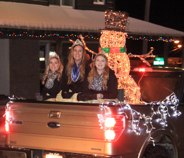 The Idaho County Fair Royalty shared a ride with Frosty the Snowman through the parade. From left are Chaye Uptmor, Selena Davila and Tiffany Sonnen.