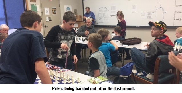 The 4th Annual Kamiah Holiday Family Chess Tournament had 24 participants at Summit Academy on December 10th, 2016. Although the weather, like the previous year, was very snowy, we had a good turnout. The Winners and their prizes follow: Overall Student Champions: 1st Place: Cody Wassmuth of Craigmont won $100 cash and he goes onto the perpetual trophy. 2nd Place: Alli Kohrman of Grangeville won $75 cash. 3rd Place: Torry Chmelik of Cottonwood won $50 cash and shared half with Ethan Oleary who tied with him. Adult Champion: Brandon Rehder of Cottonwood won $25 cash. Grade Champions: (each received a Gold/Silver/Bronze medal as their prize) Grades 1-3: 1st Place: Asher Smith of Kooskia 2nd Place: Eli Brunson of Cottonwood 3rd Place: Gryer Hollibough of Grangeville Grades 4-6: 1st Place: Cody Wassmuth of Craigmont 2nd Place: TorryChmelik of Cottonwood 3rd Place: Levi Wassmuth of Craigmont Grades 7-9: 1st Place: Alli Kohrman of Grangeville 2nd Place: Ethan Oleary of Kooskia 3rd Place: Lane Wassmuth of Craigmont Grades 10-12: 1st Place: Youngmin Sim of Cottonwood No other 10-12th graders competed Other Awards: Sportsmanship and Most Likely to Improve Awards: Anna Francis of Kamiah Best Helper Award: Tommy Rose of Cottonwood Random Award: Brandon Vetter of Grangeville We want to thank our sponsors: Justin Finney (donated $250); Hunt Hatch (donated $100); The Clearwater Progress (gave much free publicity through TheChessGuy's Chess column); Augie's Deli in Orofino (gave free ice-cream cone coupons); The following businesses placed donation jars for the tournament:; Cloningers of Kamiah; Grangeville Askers Harvest Foods; Grangeville Builders Supply; Grangeville Cash & Carry; Harvest Foods of Kooskia; Jacobs Lumber of Kamiah; Kamiah Builders Supply; Kamiah Pit Stop; Orofino Builders Supply; Orofino IGA; Perfection Tire; Stites Hardware Thanks to all for their support. Sandy