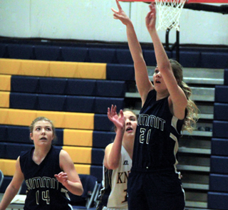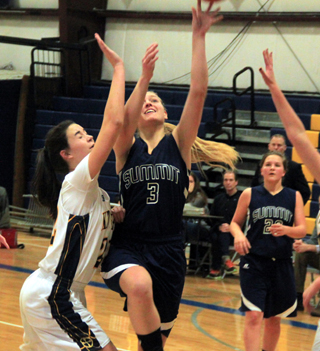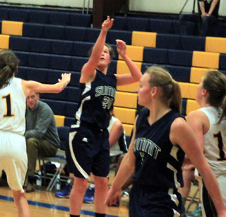 The Patriots then got things settled down and outscored Logos the rest of the half 8-4. Beckman broke a 0-16 run by Logos with a free throw and then Chmelik cashed in on a steal. After a pair of Logos baskets Lustig scored on a short baseline jumper and then buried a 3-pointer to make it 10-21 at the half. In the third quarter 5 different Summit each scored a basket and committed just 2 turnovers as the Patriots outscored Logos 10-6 in the quarter to pull within 20-27 by the end of the period. In the fourth quarter Summit continued to rally and got within 3 on a basket by Lustig with 3:32 left. After a Logos basket, Stubbers stole the ball and scored to again pull Summit within 3 with 2:40 left. Logos answered but with 1:08 left Stubbers scored again to get the Patriots back within 3. With 8 seconds left Summit had the ball and called a timeout to set up a probable 3-point try to tie the game. They were never able to get the shot off and Logos held on to win. Lustig scored 11 points to lead the Patriots with Stubbers and Chmelik adding 6 points each. Ally Sonnen scored 4 with Currier and Jessie Sonnen scoring 2 each and Beckman scored 1. Summit had a 42-40 edge on the boards against the taller Knights. Stubbers had 10 rebounds and Lustig added 8 with Chmelik pulling down 7 and Ally Sonnen 6. Currier and Chmelik had 3 steals each and Currier had 3 assists. Summit was 15 for 50 from the field, 30%, and 1 for 8 at the line, 13%. Logos was 17 for 63 from the field, 27%, and 1 for 4 at the line, 25%. Summit 2 8 10 12 -32 Logos 11 10 6 8 -35 Summit-A. Sonnen 2-11, 0-0, 4; Beckman 0-1, 1-2, 1; Currier 1-6, 0-4, 2; Lustig 5-10, 0-0, 11; J. Sonnen 1-5, 0-0, 2; Stubbers 3-10, 0-0, 6; Chmelik 3-7, 0-2, 6. 3-pointers-Lustig. Logos-Wintz 5-17, 0-2, 10; Belschner 2-11, 0-0, 4; Meyer 5-16, 1-2, 11; Whitling 3-8, 0-0, 6; Hughes 0-0, 0-0, 0; Sandmeyer 0-0, 0-0, 0. 3-pointers-none.