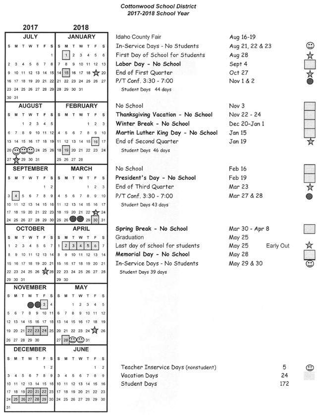The school board voted to call for bids for a new school bus at their December meeting Monday, Dec. 19. They are looking at a 47-passenger bus to replace the oldest one in the fleet, which they will use as either a trade-in or sell it. The school calendar for the 2017-18 school year was discussed. It was decided to seek public input and bring it up again at the January meeting. Superintendent Rene’ Forsmann’s proposed calendar is shown below.. A safety inspection was done by the state building inspector on Dec. 7. Forsmann said there were issues in only one room and they are being taken care of. In her facilities update Forsmann listed some possible projects. She is still working on getting some cost estimates. The board plans to look at them at the January meeting and prioritize them and give go-ahead depending on funds available. Suggested projects are: Remodel of kitchen cabinets at high school. Replace both industrial kitchen stoves, one at each building. Safety fencing at baseball field. This would be the right field fence where Center for Discovery children could possibly be hit by home run balls. Updating the restrooms at the football fieldhouse. Putting up an overflow building on the cement foundation that used to be Jake’s shop at the Elementary School. Rubberized surface and striping for the track. Purchasing a new bus The board postponed the first reading of section 5 of the policy manual until January’s meeting. The meeting dates for January and February were changed due to the regular dates being holidays. The January meeting will be moved to Wednesday, Jan. 18 at 5:30 p.m. and the February meeting will be moved to Wednesday, February 22 at 5:30 p.m. Also the February meeting will be at the High School. In the administrative reports Carrie Nygaard reported the Idaho County Shootout raised over $16,000 for our local food banks. The senior class was the winner of the class competitions. Ryan Hasselstrom has been teaching a Microsoft IT Academy course to all sophomores and all 18 students have passed the Microsoft Office Specialist Certification. One student has also completed Microsoft Excel certification. Next year all freshmen will receive Microsoft Word and Powerpoint 2016 Basic Instruction and sophomores will receive Microsoft Word Expert and Excel Basic. Ryan Uhlenkott was named Father of the Year at Daddy Date Night held Dec. 11. The 7-12 concert went very well. Seniors are selling raffle tickets to fund their after graduation drug free party. The community science night was well attended with 35-40 students participating. Junior high boys basketball is complete with both the 7th and 8th grade teams having very successful seasons. Forsmann reported the two Elementary concerts went very well. She also reported the Center for Discovery shopping day and late Friday night event went well. The school has an AmeriCorp volunteer who will be working with Elementary students on Monday, Wednesday and Friday. She is Katrina Bentley. Testing will start in January. Also hunter safety will be Jan. 9-13. As superintendent she reported the Brownfield Grant application was put off until next year’s grant cycle. The board adjourned to an executive session at 6:15 p.m. The next regular meeting will be Wednesday, January 18 at 5:30 p.m. ![]() |