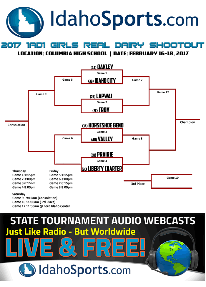 The Prairie Lady Pirates will open state tournament play at 7 p.m. PST Thursday, Feb. 16 at Columbia High School in Nampa. They will play Liberty Charter of Nampa, the third place team in District 3. If they win Thursday they would play the Valley-Horseshoe Bend winner Friday at 7 p.m. PST. With a loss they would play the Valley-Horseshoe Bend loser at 2 p.m. PST on Friday. Horseshoe Bend is the District 3 champion while Valley is the District 4 runner-up. Lapwai plays Troy at 2 p.m. PST on Thursday. The other two teams in their half of the bracket are Oakley and Idaho City. Oakley is the District 4 champion and Idaho City is the District 3 runner-up. The only other local school at state is Nezperce in the 1-A Division 2 tournament. They will open play at 2 p.m. PST against Carey at Nampa High School.