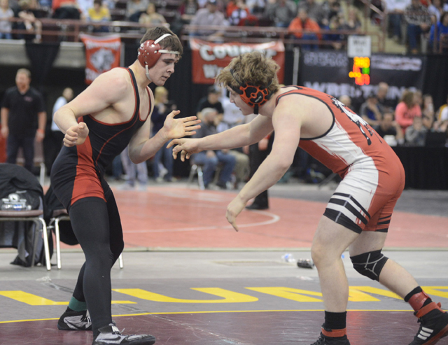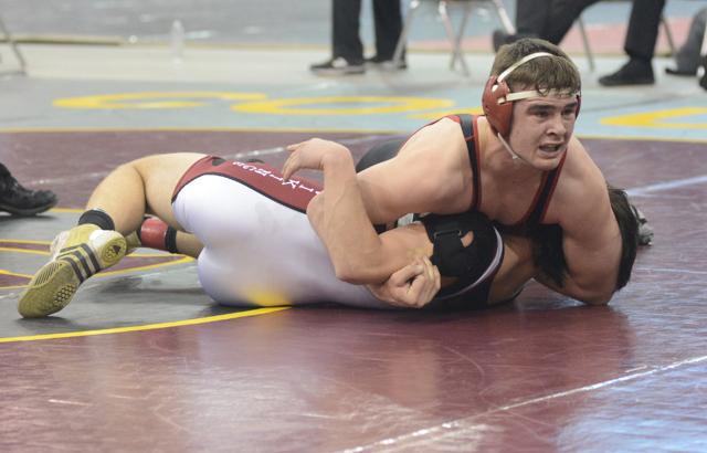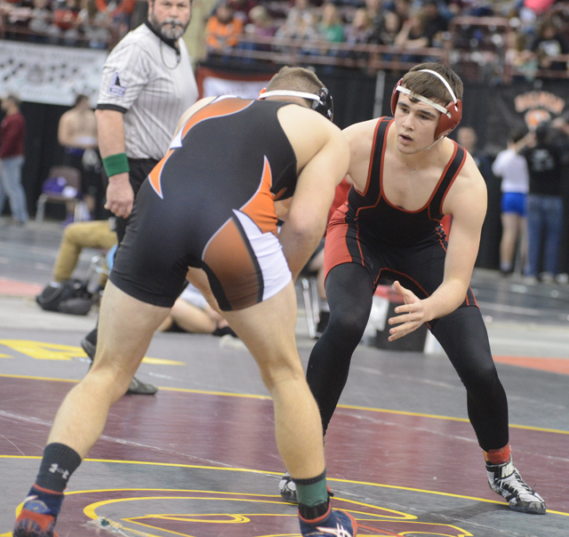 Jace Perrin was up against the eventual state champion, Tyler Mathews of Declo in the semifinals. He lost a 2-10 decision. Photo by Andrew Ottoson of the Idaho County Free Press.