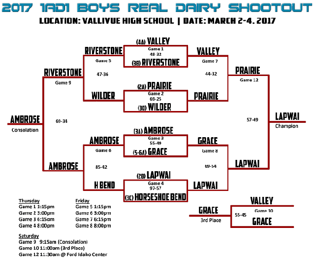 The final state tournament bracket. PIRATES BOYS BASKETBALL SCHEDULE FOR 2016-2017 *indicates league game 3-Grangeville, there, Idaho County Shootout, V only, 7:30 p.m., won 53-39 6-Kamiah, here, won 66-39 8-Troy, there*, won 48-18 15-C.V., here*-postponed due to weather 17-Lapwai, there*, (C,JV,V) 4:30, lost40-59 19-C.V., here*, makeup of 12/15 postponement, won74-29 20-Asotin, Quad, there, JV at 4:30, V at 6, C at 7:30 at Elem Gym, cancelled due to snow day school closure 5-Moscow, there, (C,JV,V), lost 29-44 7-Potlatch, there*, (C,JV,V) 1 p.m., won 62-41 13-Genesee, here*, won 53-35 18-Quad at Asotin rescheduled, JV at 6:00 p.m., V at 7:30 p.m., cancelled due to school closure, moved to Jan. 23 19-Kamiah, there*, postponed due to icy road conditions 21-Troy, here*, 4 p.m., won 63-36 23-Quad at Asotin rescheduled, again, won 56-38 24-C.V., there*, won 72-40 27-Lapwai, here*, (C,JV,V) 4:30, lost 38-46 30-Grangeville, here, won 68-40 3-Genesee, there*, won 72-61 4-Potlatch, here*, (C,JV,V) 1 p.m., lost 40-41 in overtime 7-Moscow, here, (C,JV,V) 4 p.m., won 72-60 9-Kendrick, here, won 71-30 *League game 14-District at LCSC vs. Potlatch, won 45-35 24-District Championship vs. Lapwai, 7:30 p.m., won 50-49 March 2-4-State at Caldwell, beat Wilder 69-25, beat Valley 44-32, lost to Lapwai 49-57, 2nd at State. 2017 Prairie Boys Baseball Schedule MARCH 23-CV, there, 4:00 25-Genesee, here, 10:00 a.m. 28-Lapwai, at Clearwater Field, 4:00 7-Glenns Ferry Tournament – Glenns Ferry, 3:00 p.m. 8-Glenns Ferry Tournament – Declo, 9:00 a.m. 8-Glenns Ferry Tournament – Nampa Christian, 11:30 a.m. 11-Lapwai, here, 4:30 13-Grangeville, there, 4:00 15-Potlatch, here, (2), 12:00 18-Nezperce, here, 4:30 20-CV, here, 4:00 22-Grangeville, here, 1:00 27-Genesee, there, 5:00 29-Troy, there, (2), 11:00 5-12-District at Orofino, TBA 19-20-State at Lewiston, TBA |