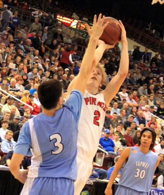 Vs. Wilder Prairie was expecting to play Genesee in their opening round game after knocking off Lapwai in the district championship game but Wilder edged out the Bulldogs in a play-in game. Wilder then started out against Prairie like they were going to pull another upset as they jumped out to a 0-6 lead. Patrick Chmelik got the Pirates on the board with a putback at the 5:13 mark of the opening quarter and added another a minute later. Hunter Chaffee tied it on a feed from Gavin Branson at the 3:51 mark. Chmelik scored inside with an assist from Tyson Schlader a minute later to give Prairie their first lead. Prairie wound up scoring 15 straight points to take a 15-6 lead by the end of the quarter. Two baskets by Schlader and a lay-up by Brandon Anderson made it 21 straight points and a 21-6 lead by the 5:27 mark of the second quarter. Wilder finally broke the run with a 3-pointer. After a basket by each team made it 23-11, Chmelik scored on an alley-oop pass from Branson to kick off a 14-0 run that ended the half with Prairie up 37-11. Prairie had outscored Wilder 37-5 after falling behind 0-6. In the second half Wilder tried, unsuccessfully, to shoot their way back into the game from 3-point range as they wound up connecting on just 2 of 12 attempts from long range and 7 of 32 overall. Prairie meanwhile just kept pulling away as they converted 6 of 10 in the third quarter and 8 of 13 in the fourth. Chaffee and Chmelik wound up with 18 points each to lead the team in scoring. Anderson added 11 points with Schlader scoring 9, Spencer Schumacher 4, Devin Ross 3 and Lucas Wemhoff, Dylan Schumacher and Derik Shears 2 each. Schlader had 13 rebounds to lead Prairie to a 54-19 domination of the boards over the smaller Wildcats. Branson had a great game at the point with 15 assists while Schlader and Spencer Schumacher each had 2 steals. Schlader and Chmelik each had 3 blocked shots. Prairie was 31 for 59 from the field, 53% and 1 for 3 at the line, 33%. Wilder was 12 for 56 from the field, 21%, and 0 for 2 at the line. There were just 10 total fouls called in the game, 6 on Prairie and 4 on Wilder. Prairie 15 22 13 19 -69 Wilder 6 5 6 8 -25 Prairie-Schlader 4-8, 1-1, 9; Chmelik9-13, 0-2, 18; Chaffee7-13, 0-0, 18; Branson 0-1, 0-0, 0; Anderson 5-8, 0-0, 11; S. Schumacher 2-7, 0-0, 4; Wemhoff 1-2, 0-0, 2; Gehring 0-1, 0-0, 0; Ross 1-2, 0-0, 3; D. Schumacher 1-2, 0-0, 2; Shears 1-1, 0-0, 2; Uhlenkott 0-0, 0-0, 0; Schmidt 0-1, 0-0, 0. 3-poinbters-Chaffee 4, Anderson, Ross. Wilder-Blanco 4-13, 0-0, 8; Vargas 1-5, 0-0, 2; Renteria 0-0, 0-0, 0; C. Aguilar 1-14, 0-0, 2; Cortez 3-6, 0-0, 9; E. Aguilar 1-4, 0-0, 2; Gonzalez 1-8, 0-2, 2; Rodriguez 0-4, 0-0, 0; Escutia 0-1, 0-0, 0; Martinez 0-0, 0-0, 0. 3-pointers-Cortez 3. P rairie