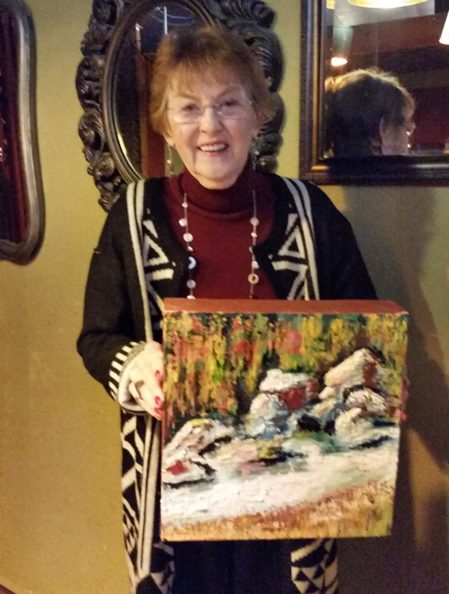 Ellamae Holes with one of her paintings. Vickie Cole featured In anticipation of Central Idaho Art Association’s (CIAA) 50th Spring Show, May 4, 5, and 6, CIAA celebrates founding member, Vickie Cole. The 50th Show remains at the Bicentennial Historical Museum and will feature the art of Founding Members. Mrs. Cole remains an active member. Each year she participates in CIAA shows. She served the office of the first Vice President. During the second year of the club, in 1969, she served as President. One of her various goals in the first years of CIAA and while President was to ensure the club had a Gallery. With great member involvement, determination and laughter, the club obtained the Blue Camas Art Gallery, at the generosity of John and Carm Spencer. The Blue Camas Art Gallery’s grand opening was July 3, 1969, at 105 North 2nd Street, Grangeville. Additionally, Vicki Cole was Spring Show judge in 2006. During one of the first CIAA shows, members decided to make and post a sign at the highway to announce the show. Richard Eimers and Vicki’s husband, Wayne, were quite put out to return with white paint on their clothes. The Benedictine nuns at St. Joseph’s Elementary School in Cottonwood launched her desire to be an artist beginning in the fourth grade. She continued her education at Seattle University where she earned her B. A. She took all the art classes she could and was especially inspired by an art teacher, Dr. Demasus. Also of great inspiration was an instructor from Alaska only known as “Happy”. In Arizona, Mrs. Cole took further art classes. As did many CIAA members, Mrs. Cole took classes and inspiration from local artist, Ladd Arnoti. Mrs. Cole taught art from her home studio for over 10 years. Her classes included instruction in drawing, perspective, design, mixing colors and using charcoal. She loves the expressive style, art that makes a statement and is rich in color, design and texture. “I think you relate to people in your art”, she believes. She happily states that she loves “to stay outside the box”. Oil and charcoal are favorite media she uses and her favorite subjects include rocks, trees, and water. Besides creating art, Mrs. Cole enjoys her family. She has four daughters, one was a college exchange student in Florence. She and her husband have also traveled to Barcelona, Spain. There, she was able to visit the Dali Museum. Dali and Picasso are two of her favorite artists. Cole enjoyed other creative ventures in dramatics, music (piano). She was in many school plays and presented many readings. She performed the part of Jo in “Little Women”. She was a tap dancer and a skier. And she fondly remembers being the Lewiston Round-up Princess in her young years. Mrs. Cole dedicated care-giving to family the past years. She is an up-beat, on-the-go person. She loves the people in her life!