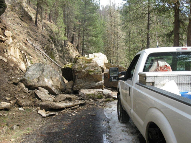 A rockslide blocks Selway Road 223. Photo by U.S. Forest Service. |