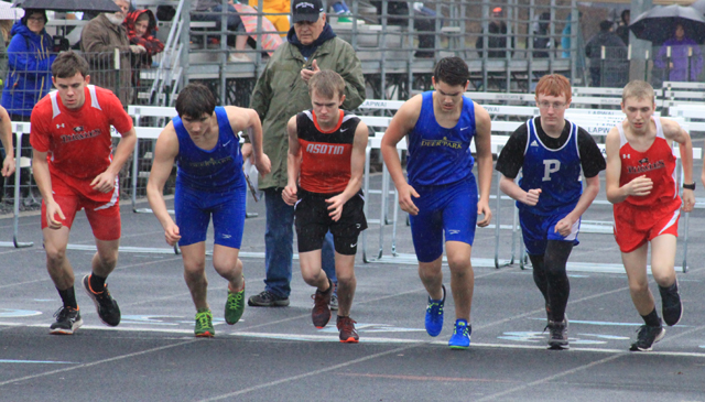 Grant Gehring, far left, and James Villamor, far right, at the start of the boys 3200 race.