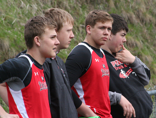 Prairie throwers wait for their turn at the Orofino Invitational. From left are Hayden Uhlenkott, Carson Schmidt, Ryan Glimp and Tucker Hibbard. Photo by Steve Wherry.