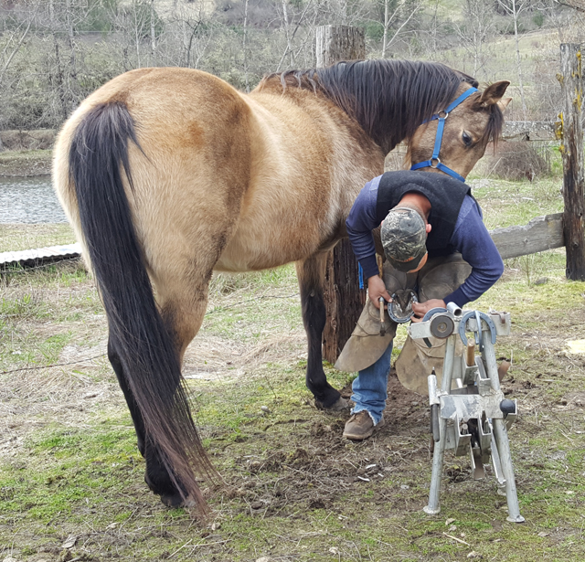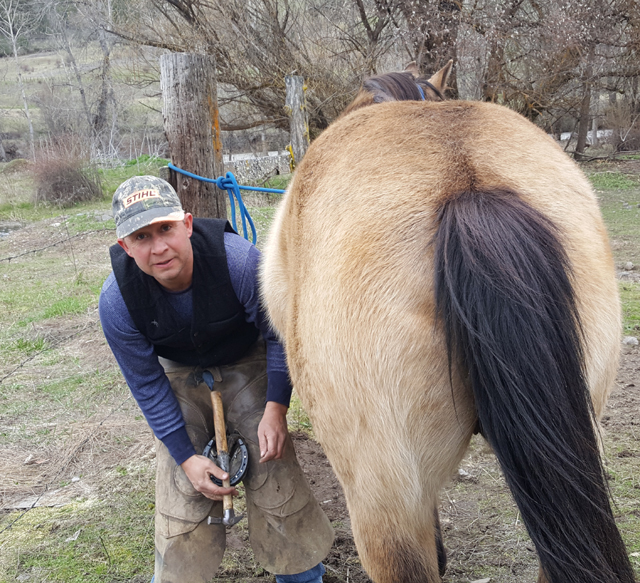 Shane Hendren, one of the presenters at the Backcountry Horsemen event this Saturday, is shown shoeing a horse in the above two photos. |