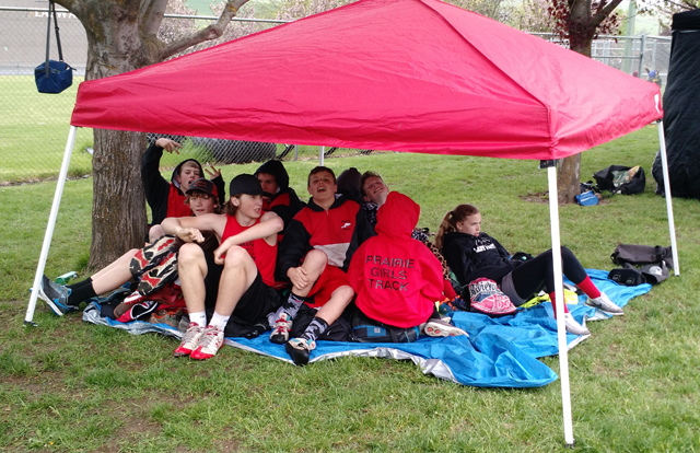 This is what the Prairie Junior High Track team does when it is raining all spring. Hide in the tent. Their next meet is Saturday at 9 a.m. at Kamiah. Photo by Glenn Poxleitner.