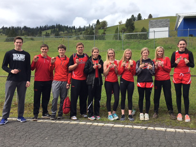 Prairie track medal winners from the April 19 meet at Lapwai. From left are Patrick Chmelik, Grant Gehring, Luke Wemhoff, Ryan Glimp, Chaye Uptmor, Mykaela McWilliams, Jordyn Higgins, Theresa Wemhoff, Laney Uhlenkott and Ciara Chaffee. Photo by Becky Higgins.