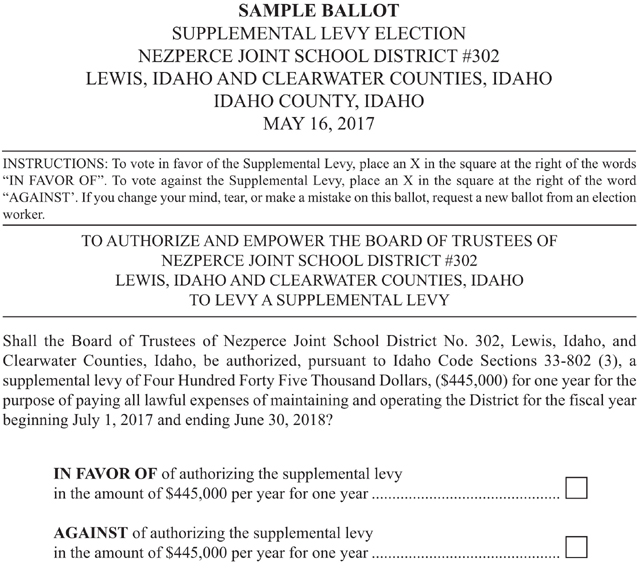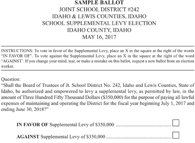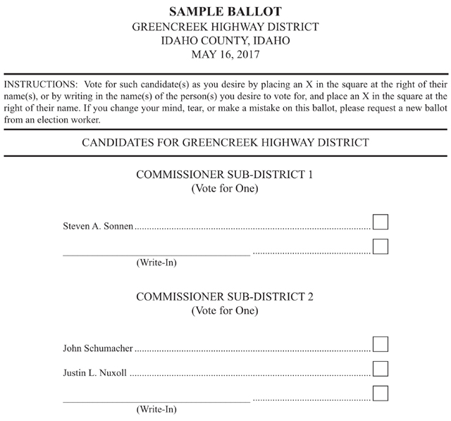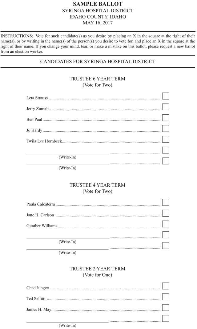 In addition to the school levy there are also a couple other elections affecting area residents. The Greencreek Highway District has a contested election for Sub-District 2 Commissioner with incumbent John Schumacher being challenged by Justin Nuxoll. Also those in the Syringa Hospital District have 3 contested Trustee elections. See sample ballots below:
