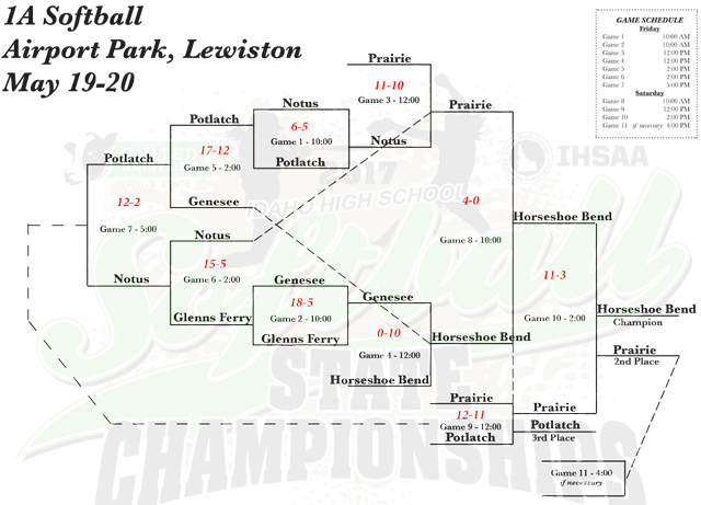 . 2017 Prairie Lady Pirate Softball Schedule MARCH 17-Kendrick, there, 4:00, postponed due to wet field 21-Kamiah, there, 4:00, postponed due to wet field 23-Culdesac, there, 4:00, won 12-10 25-Kellogg (2), at Lewiston, 12:00, cancelled 28-Lapwai, there, 4:00, postponed to May 2 15-Potlatch (2), here, Moved to Airport Park #3 in Lewiston, game time 12 noon. won 15-14 and 15-5 18-Genesee, there, 5:00, rescheduled to April 19 at Asotin, won 15-5 21-Grangeville (V,JV), here, 4:00, cancelled 25-Genesee, here, 5:00, postponed due to wet fields 27-Kamiah, here, 4:00, postponed to Monday, May 1 at Kamiah 29-Troy (2), there, 11:30, moved to Airport Park in Lewiston, won 13-10, 19-9 2-Lapwai, here, (2) 4:00, won 24-2, 17-1 5-Waitsburg (2), there, 4:00, won 17-3, 24-4 8-Kendrick (2) , here, 4:00, won 18-11, 20-10 9-Genesee, here, 4:30, won 12-11 in 8 innings 11-District play-in game vs. Kamiah, here, 4:30 p.m., won 17-2 13-Districts at Orofino 11 a.m. and 1 p.m., beat Kendrick 15-9, beat Genesee 8-5, District Champions!! 19-20-State Tournament, Lewiston, beat Notus 11-10 in 10 innings, lost to Horseshoe Bend 0-4, beat Potlatch 12-11, lost to Horseshoe Bend 3-11, 2nd at State. |