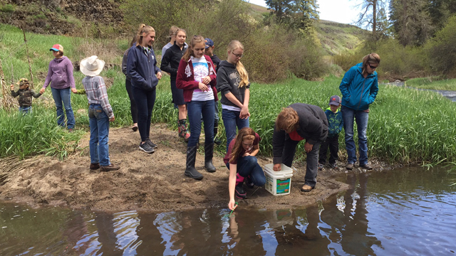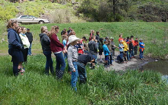 On May 15, the Agricultural Class from Nezperce and Highland, 4th grade students from Highland and Prairie, and 7th and 8th grade students rom Summit Academy completed their “Hatchery in the Classroom” program with the release of about 300 (2 to 3 inch long) steelhead into Lawyers Creek. Jill Olson, U S Fish and Wildlife Service, Dworshak Fisheries, delivered 103 steelhead eggs to each classroom in March. The classes, with the assistance of their teachers, monitored the water temperature and clarity. When the fish eggs hatched the students took charge of feeding them in addition to the monitoring duties. The LSCD received a grant in 2013 from the Nez Perce Tribe to purchase aquariums for the schools as part of their ongoing Information and Education programs. This hatchery project demonstrates the commitment the Lewis Soil Conservation District (LSCD) has towards improving fish habitat and water quality. The LSCD wishes to thank Kyle Stapleton, Pam Turnbull, Danette Horrocks, Becky Higgins, Kristi Bruegeman, Kim Uptmor for their vigilance in rearing the fish in their classrooms, also thank you to Jill Olson for their support in making the project such a success.