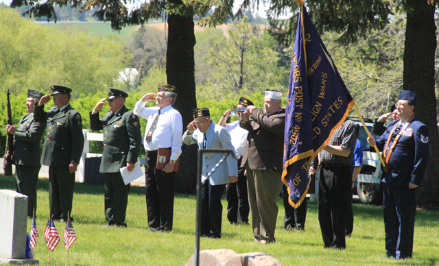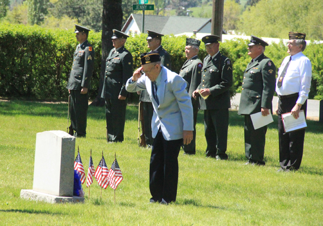 Fred Seubert salutes after laying the wreath at Cottonwood Community Cemetery.