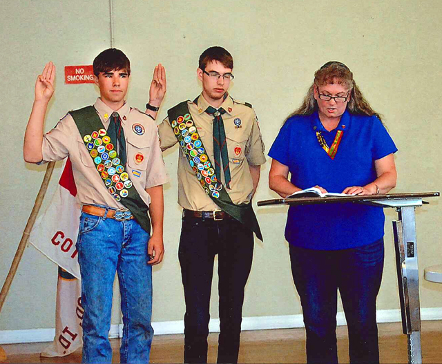 Tate and Blaze reciting the Eagle Scout Promise with Scoutmaster Shari Chaffee.