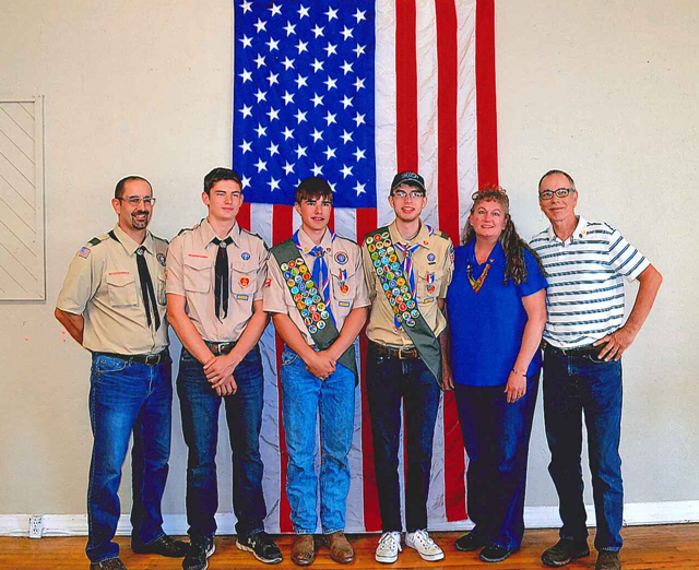 Shown from left are Scoutmaster Travis Huisman and son Tanner from Troop 4070 of Washington, Eagle Scouts Tate and Blaze Berdoy, local Scoutmaster Shari Chaffee and Committee member Brad Berdoy. Photos provided by Shari Chaffee. |