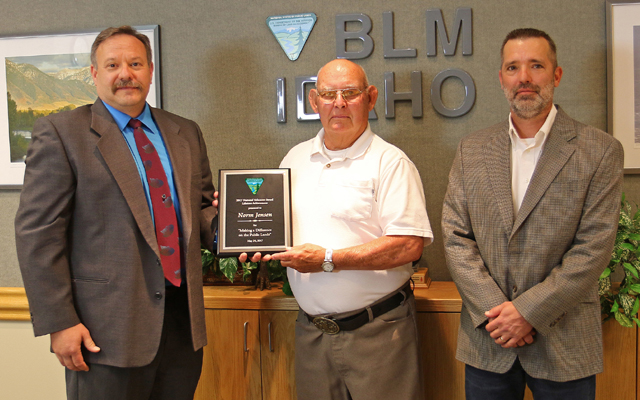 Longtime BLM volunteer Norm Jensen, center, received BLM’s Making a Difference Lifetime Achievement Award at a ceremony in Boise in May. |
