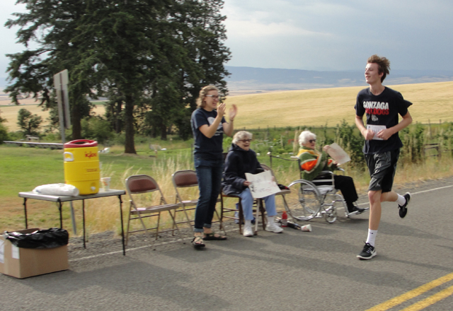 Monastic Intern Katie Waltar, Sister EvangelaBossert, and Sister Jean Lalande cheer on runner James Carlson at the 2016 Raspberry Festival Fun Run & Walk. |