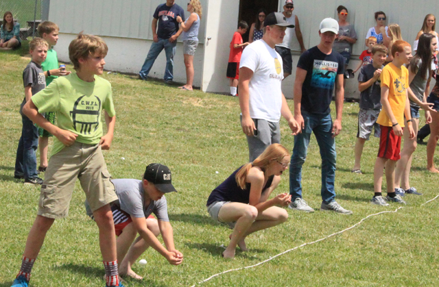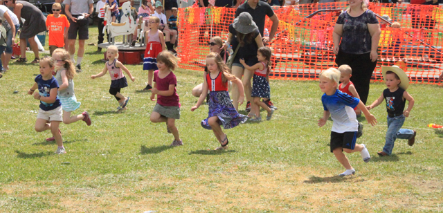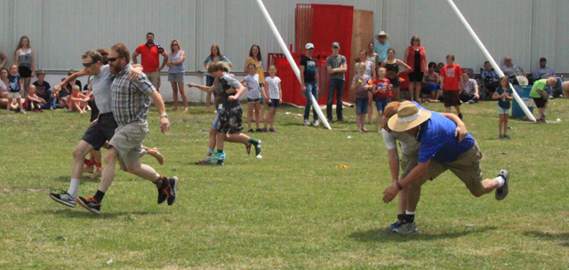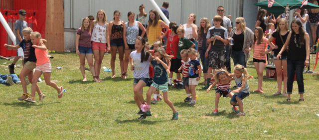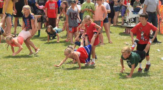 The 3-legged race saw its share of spills as the young ladies at right appear about to fall.