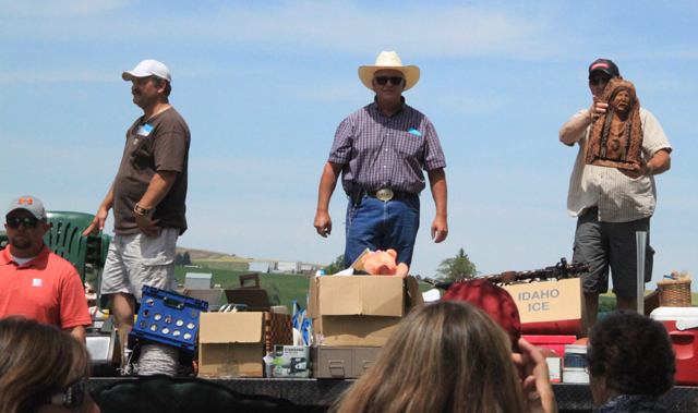 John Schumacher, cowboy hat, served as auctioneer at Greencreek with helpers from left, Ben Schumacher, Don Schumacher and Aaron Hinkelman.