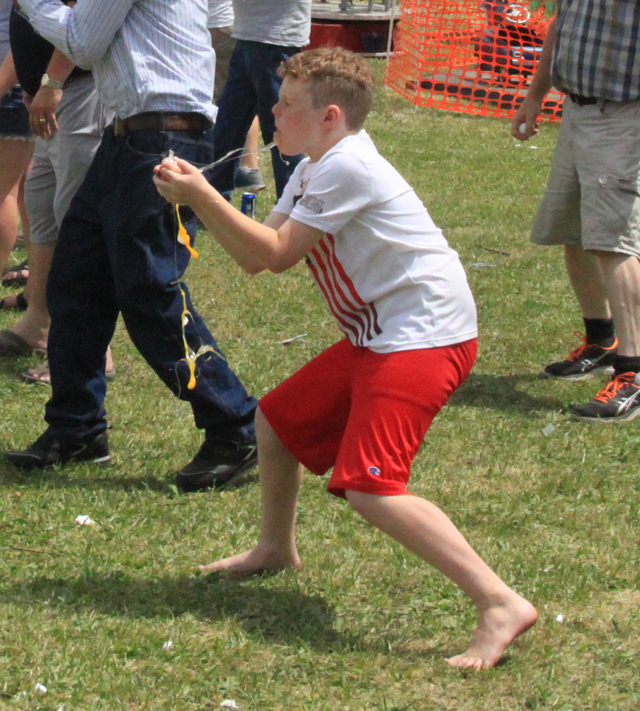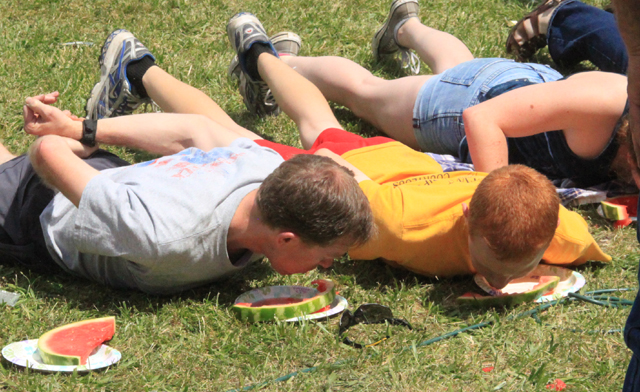 He may have taught his son too well as Eric Nuxoll was edged out for the Greencreek Watermelon Eating championship by his son with the red hair and yellow shirt.