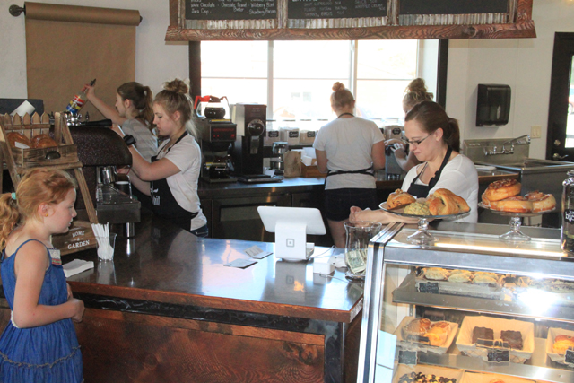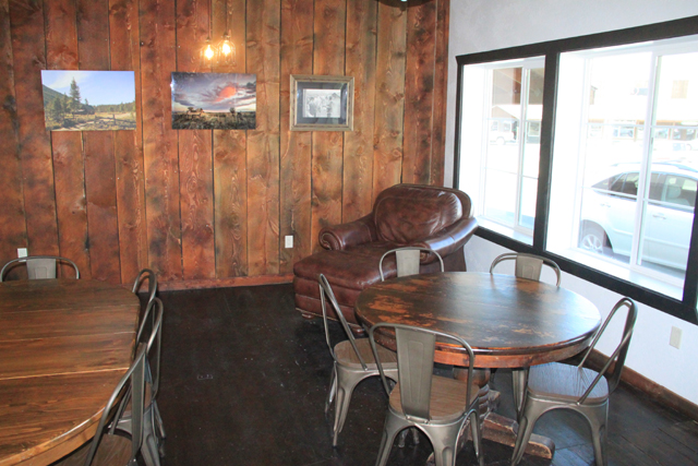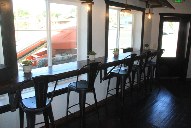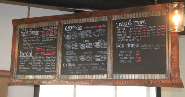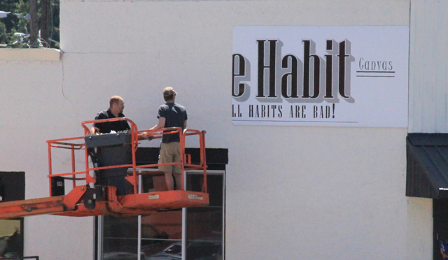 The crew of The Habit hard at work filling orders last Friday. Photos below, top to bottom show their menu and some of the seating areas where patrons can kick back and relax with their coffees, the bar at the windows facing King Street and Ryan Uhlenkott and an assistant in the process of installing the sign on the Front Street side of the building.