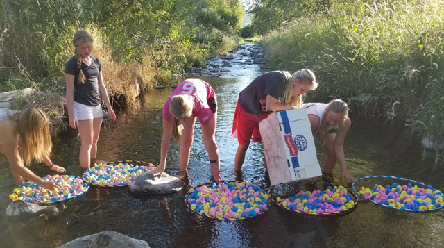 Getting ready to release the ducks are Kodie Tidwell, Theresa Wemhoff, Leah Higgins, Lori Mader and Hope McIntire.