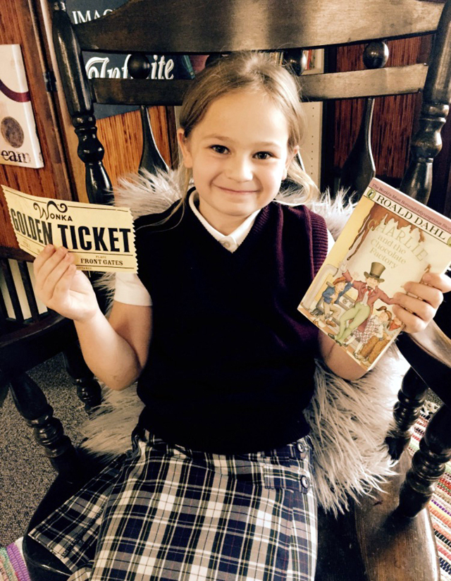 shadow box and in the lower photo, Ava Mosley with a golden ticket and