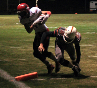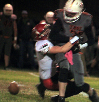 Troy had to punt and Nick Mager muffed the punt before recovering and returning it 6 yards to the Prairie 36. Damian Forsmann then completed a pass to Hunter Chaffee who gained 26 yards before fumbling the ball right back to Troy at the Troy 38. Troy was able to take the ball and score to take a 0-6 lead. Prairie stopped the 2-point try short of the goal line. Prairie had to punt the ball away on their third possession with Troy taking over at their own 45. The Trojans moved to the Prairie 24 before Jace Perrin sacked quarterback Rhett Sandquist, who fumbled with Troy recovering for an 18 yard loss. Prairie wound up taking over on downs at their own 42. The Pirates ended the first quarter with a 32 yard pass from Forsmann to Chaffee to put the ball on the Troy 29. Once they got past the first quarter, Prairie stopped fumbling the ball and exploded on offense. Five plays into the second quarter Jake Stubbers took a pitch around right end for 23 yards to the 1 yard line. Forsmann scored on the next play to tie the game and Caleb McWilliams, back in action after missing the previous game with an injury, bulldozed into the end zone for the 2 point play to give Prairie the lead. The lead was short-lived though as Isaac Stoner received the kickoff, threw a lateral across the field to Sam Taff, who raced up the right sideline for an 80 yard kickoff return touchdown. Prairie again stopped the 2-pointer but trailed again at 8-12. Chaffee returned the ensuing kickoff 27 yards to the Troy 48. Prairie needed just 6 plays to score their second touchdown. Forsmann picked up 12 on a keeper and McWilliams burst through the middle for 31 to the Troy 3 yard line. Stubbers scored on the next play to put Prairie on top for good at 14-12 with 8:05 left in the half as the 2-point try failed. 15 yards worth of penalties forced Troy into punt formation. Taff tried a fake punt but was tackled by Perrin and Carson Schmidt well short of the first down as Prairie took over on the Troy 41. Stubbers ran a sweep to the right on the next play and went 41 yards for another Pirate touchdown. The 2-point try failed but Prairie now led 20-12. Troy answered back with a 58 yard pass from Sandquist to Stoner but Prairie again stopped the 2-point try and held on to the lead at 20-18. The two teams then traded punts with Prairie taking over at the Troy 46 on the exchange. McWilliams burst through the middle and ran over a defender at about the 35 without even slowing down on his way to a 46 yard touchdown. The 2-point try again came up short as Prairie led 26-18 with 2:11 left in the half. Prairie forced another punt and took over at the Troy 47. It was another 1-play scoring drive as Forsmann connected with Chaffee deep down the field for a 47 yard touchdown pass. Stubbers ran in the 2-pointer to make it 34-18 with 1:30 left in the half. Prairie again forced Troy to punt after 3 plays and took over at the Troy 41. Playing in hurry-up mode Prairie picked up a first down on runs of 9 yards by McWilliams and 7 by Forsmann. A facemask penalty on the Forsmann run moved the ball to the 13. A