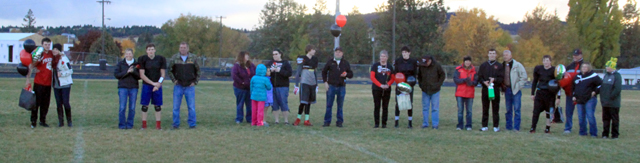 Even though the game was cancelled, Prairie football still held Senior Night ceremonies Friday evening. From left are Jayce Uhling with his mother Karie Geis; Jake Stubbers with his parents, Dale and Jeanne; Nick Mager with his parents John and Denise Mager and Heidi Ahlers and his sisters; Hunter Chaffee with his parents Kevin and Shari; Jace Perrin with his parents Scott and Tina and Dereck Arnzen and his parents Brendan and Molly and brother Jeff. PIRATES BOYS FOOTBALL SCHEDULE FOR 2017 11-Salmon River, here, won 52-34 15-Council, here, 6 p.m., won 60-8 22-C.V.*, there, won 64-28 29-Kamiah*, here, Homecoming, won 38-12 14-Wallace*, there, 2 p.m., won 66-14 20-Potlatch*, here, won by forfeit 27-Lapwai*, there 10 or 11-State Semifinals 17 or 18-State Championship *League Game |
