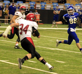The 28 points scored by Genesee was their lowest output all season, second only to the 36 they scored against Prairie the first time these two teams played. Like the earlier matchup, Prairie’s only loss of the season, the Pirates scored first after receiving the opening kickoff. In the earlier game it took just 1 play, this time it took 4. Caleb McWilliams had the big play with a 49 yard run from the Prairie 44 to the Genesee 7. Jake Stubbers went 5 yards to the 2 and Spencer Schumacher then scored on a quarterback sneak. The 2-point try ended with a fumble giving Prairie a 6-0 lead. Also just like the first game, Genesee came right back with a scoring play of their own. Starting quarterback Kolby Moser picked up 16 yards on the first play but apparently broke a finger on his left, non-throwing, hand and had to leave to game to get it taped up. Backup quarterback Hayden Woods came on and converted fourth and 11 with a 42 yard pass to Coy Stout that set Genesee up with first and goal at the 8. Three plays later Woods scored from the 5 to tie the game. Unlike the first meeting, Prairie stopped the 2-point try. Also unlike the first game, Prairie answered right back with another scoring drive. Jayce Huling returned the kickoff from the 5 to the 35. Prairie took 11 plays to travel 65 yards. Prairie converted two third down plays on the drive and on the touchdown they faced fourth and 5 from the 16. Schumacher found Hunter Chaffee open over the middle at the 5 yard line. Chaffee took a shot from Moser, spun away from it and into the end zone to put Prairie back on top 12-6. On the 2-point play Prairie ran a tackle-eligible play to Carson Schmidt, who was unable to hold on to the low pass. On Genesee’s next possession the Bulldogs faced a third and 7 from their own 38 and Moser’s pass was intercepted by Jake Stubbers at the 50 and returned to the 43. Prairie faced a fourth down and 10 from the 43 and ran a hook and lateral play. Schumacher passed to Chaffee who lateraled back to a trailing Stubbers, who went 38 yards for a first and goal at the 5. 3 plays that netted just 1 yard plus a delay of game penalty saw Prairie facing a fourth and goal from the 9. Schumacher passed to Nick Mager in the end zone for the touchdown and Stubbers ran in the 2 pointer to make it 20-6. At that point Prairie was 3 for 3 in the game on fourth down tries. Genesee was able to answer back with Moser connecting with Edward Becker for 48 yards to the Prairie 25 and then keeping it for a 25 yard touchdown. Stout’s 2-point try was stopped short by McWilliams, Owen Anderson and Schumacher, leaving the score at 20-12. Genesee then got the ball right back on a fumble by Stubbers that saw Jon Kopf recover for Genesee at the Genesee 45 yard line. After an incomplete pass, Becker was able to cut back against the grain and avoid a tackle attempt in the backfield to go 55 yards for a Genesee touchdown. Moser then passed to Becker for the 2-pointer that tied the game at 20-20 with 8:25 left in the half. Prairie came right back with the go-ahead score. The Pirates took over on their own 40 after the kickoff. A 21 yard pass play to Chaffee moved the ball to the 39. On third and 7 from the 36, Schumacher connected with Stubbers down the middle for a 29 yard game to set up first and goal at the 7. Schumacher picked up 5 yards on first down and then pushed his way into the end zone on the next play to put Prairie back on top. Stubbers ran in the 2-point try on a sweep to the left to make it 28-20. Genesee twice threatened to score late in the half. A pass interference penalty helped Genesee get a first down in Pirate territory. Stubbers tackled Moser in the backfield for a 7 yard loss which led to a fourth and 10 from the Prairie 21. Moser kept the ball but was pushed out of bounds at the 13, 2 yards short of a first down. Prairie took over with 1:39 left and picked up a first down at the 24. The next 3 plays were incomplete passes and they punted the ball away with Genesee taking over at their own 42 with 38 seconds left. On